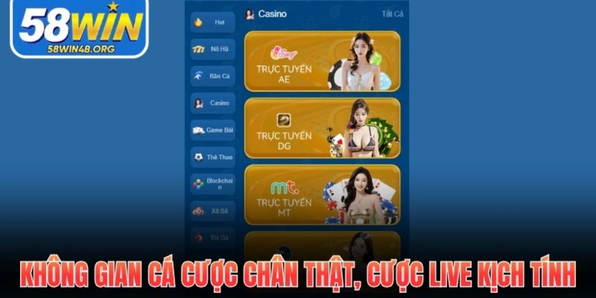 Casino online 58WIN là không gian cá cược được tái hiện chân thật từng chi tiết, kết hợp hài hòa giữa công nghệ hiện đại và cảm xúc đỏ đen truyền thống. Không gian này mang lại trải nghiệm hoàn toàn khác biệt, nơi mọi hành động của dealer đều được tái hiện lên sắc nét, mượt mà như đang ngồi tại một sòng bài thực thụ.